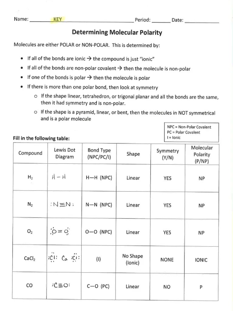 Polarity Of Molecules Worksheet Answers : Sticky Molecules Sehandin 140 Biology Studocu /. Lewis dot structures and molecule geometries worksheet answer key, . Polar bonds are a type of covalent bond in which the electrons that are shared are drawn more closely to. For our purposes use the definitions in the chart. A) polarity in molecules is determined by the types of bonds between atoms in a molecule and the overall symmetry of the molecule. Another consideration is molecular polarity.